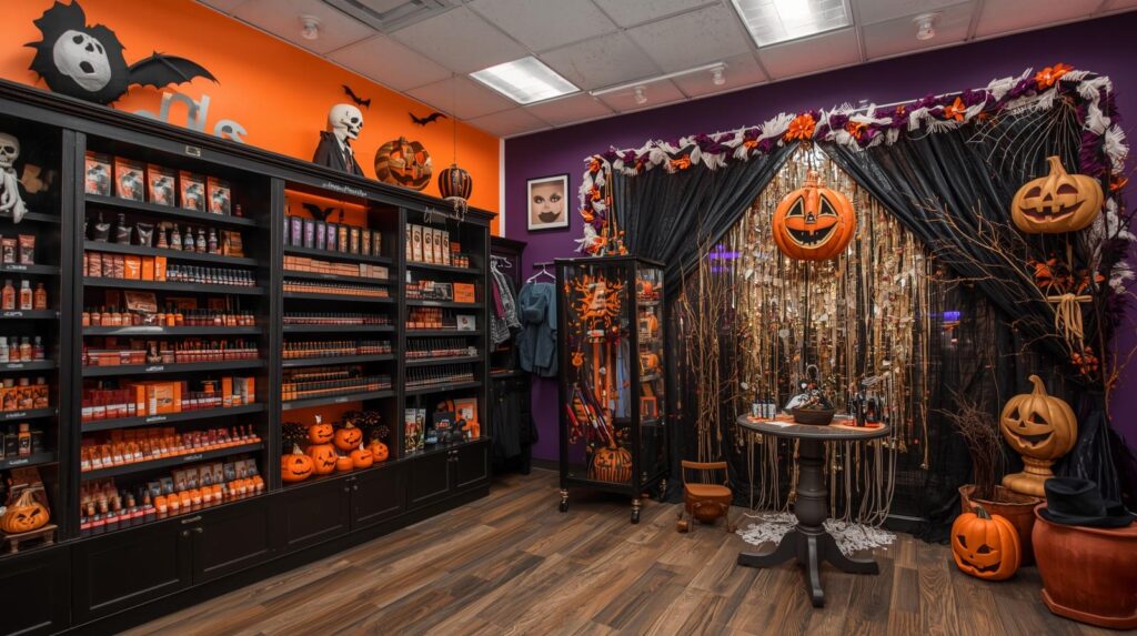 店舗入り口やレジ前をハロウィンカラー(オレンジ×ブラック×パープル)で統一し、「フォトブース風コーナー」を設置しましょう。